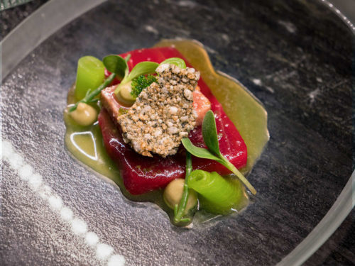 Food Art an der Kitchen Party. Aufnahme: Vorserienmodell der Panasonic GH5, mit dem Leica Lumix DG Elmarit 2.8–4.0/12–60mm ASPH O.I.S auf 48 mm // 1/125 sec. // f 3.9 // 320 ISO // vorhandenes Licht // ohne Stativ. Postproduktion: Leichtes Nachschärfen Kommentar: Grossartige Detailwiedergabe