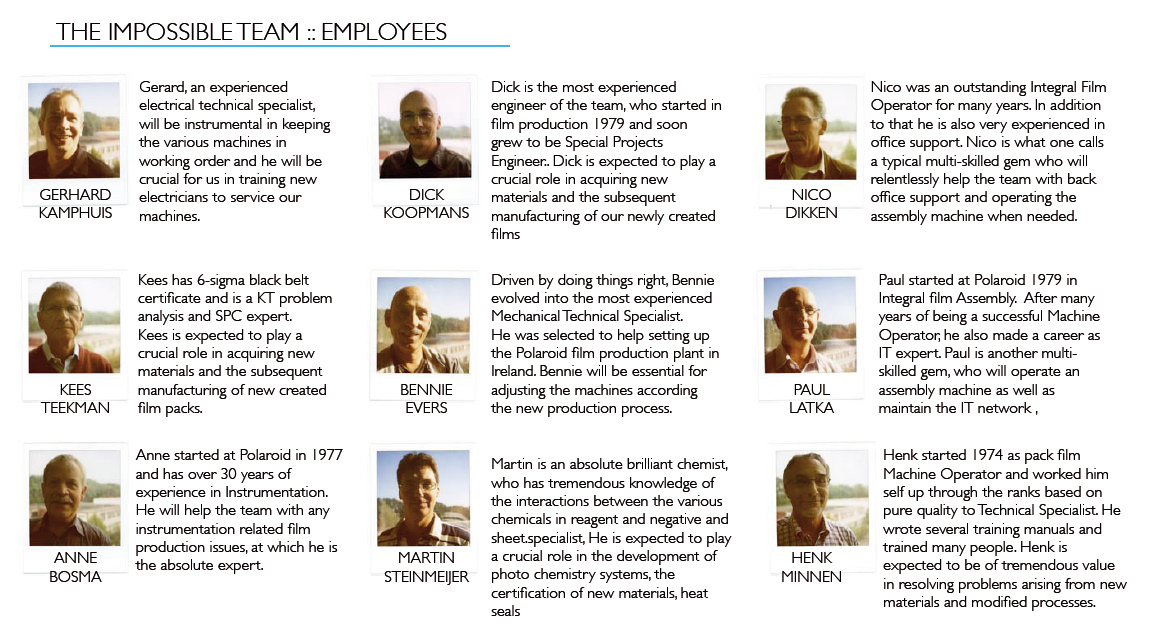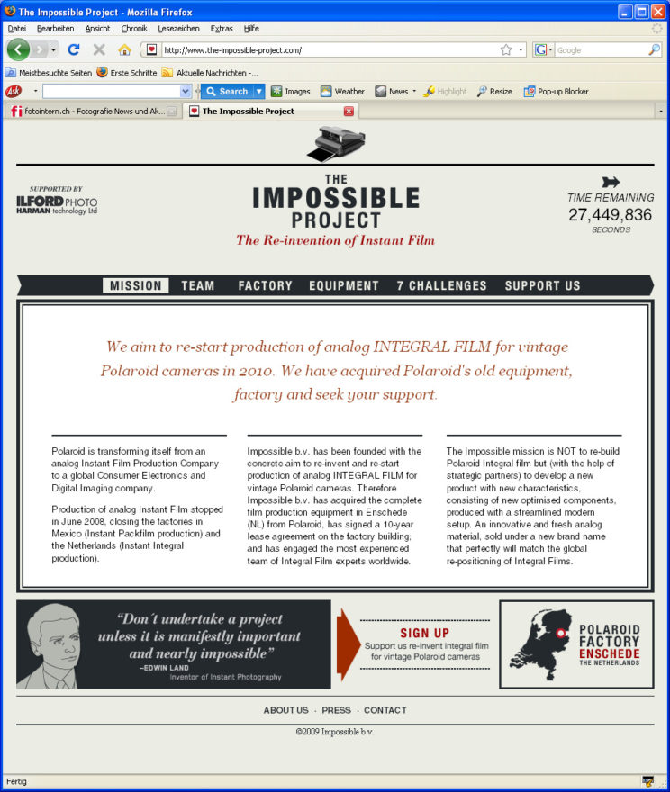 Die Gruppe von Wissenschaftlern und Technikern arbeitet seit Oktober 2008 fieberhaft an ihrem „unmöglichen Projekt“, wie sie das Vorhaben auf ihrer Webseite selbst bezeichnen. Die Zeit läuft (siehe Webseite oben rechts), das Jahr 2010 naht. Vieles muss neu erfunden und gegenüber den früheren Fabrikationsverfahreen verbessert und modernisiert werden. Es müssen neue Lieferanten gefunden werden, denn viele der früheren Partner gibt es nicht mehr, oder diese haben sich produktemässig, seit dem Ausstieg von Polaroid aus dem Filmgeschäft, neu orientiert.