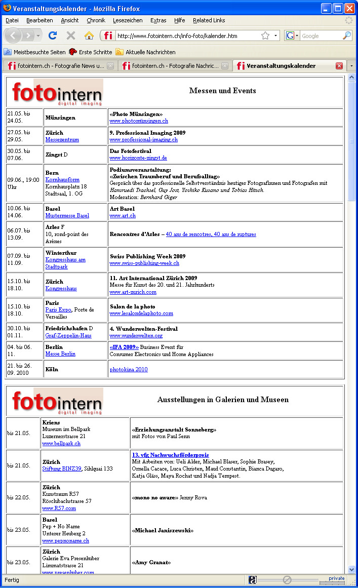 Sollten Ihnen Ausstellungen und Veranstaltungen bekannt sein, die wir nicht aufgelistet haben, so sind wir Ihnen für alle Informationen dankbar. Bitte senden Sie uns ein E-Mail auf mail [at] fotointern.ch.