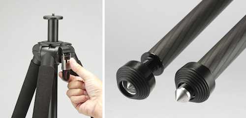 velbon_geo_details_klEin komfortabler Klemmhebel mit Sicherheitsverschluss sorgt für ein schnelles Ausrichten der Mittelsäule. Die Mittelsäule der GEO Stative ist zweigeteilt und ermöglicht eine sehr niedrige Aufnahmeposition, wie er etwa in der Makro-Fotografie verwendet wird. Eine spiralförmige Veredelung der Carbon-Elemente erlaubt ein gleichmässiges und komfortables Ausziehen der Stativbeine. Aufgedruckte Masseinheiten im Intervall von 2,5 und 5 cm erleichtern dabei eine genaue Justierung der Beine. Ein 2-Wege-Gewinde am Stativbeinfuss sorgt darüber hinaus für einen schnellen Wechsel von rutschfestem Gummifuss zu einer Metallspitze.
