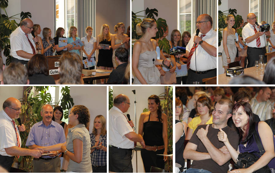 In der Ostschweiz ist alles eine Nummer kleiner – aber nicht weniger herzlich. Die diesjährige Diplomfeier fand am Sonntagnachmittag, 5. Juli 2009, im Viersternhotel „Inseli“ in Romanshorn statt. Rund sechzig Personen hatten den Weg dorthin gefunden und warteten bei schwüler Hitze darauf, bis sie in den Tagungsraum eingelassen wurden, um die Prüfungsarbeiten der insgesamt 18 Absolventen zu bewundern. Und mit Spannung wurde schliesslich der Bericht von Chefexperte Gabriele Pecoraino erwartet, der die Diplomübergabe einläutete: