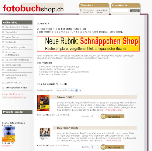 Möchten Sie noch ein Buch über Photoshop CS3 zum halben Preis? Oder suchen Sie ein Buch zur EOS 350D, weil dort mehr Praxistipps drin stehen als in der Bedienungsanleitung. www.fotobuchshop.ch, die Schweizer Spezialseite für Fachbücher über Fotografie und Digital Imaging, hat jetzt eine Rubrik «Schnäppchen Shop» eröffnet, in der Restexemplare, vergriffene Titel und antiquarische Fachbücher on online bestellt werden können.