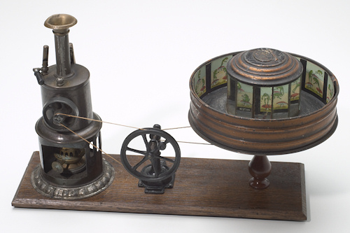 Diese optische Spielzeug zeigt die Grundfunktion aller nachfolgenden Modelle: Phasenbilder müssen sich vor dem Auge vorbeibewegen und müssen laufend durch eine Art Blende unterbrochen werden. Hier werden einer Scheibe werden Phasenbilder einer Bewegung gemalt, durch umlaufende Sehschlitze wird das sich drehende Rad in einem Spiegel betrachtet – und die Bilder werden lebendig!