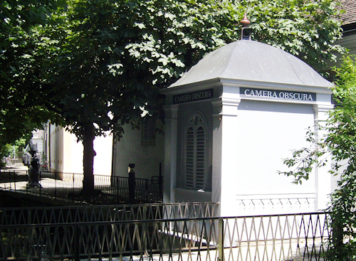 Ebenso einfach wie genial – und zudem grundlegend für die Entwicklung von Fo-tografie und Kino – ist die Camera Obscura (lateinisch: dunkler Raum). Bohrt man in eine Wand eines geschlossenen dunklen Raums ein kleines Loch, projizieren die Lichtstrahlen des hellen Aussenraums das Aussenbild durch das Loch auf die gegenüberliegende Innenwand – allerdings steht das Bild auf dem Kopf. Die Camera Obscura war seit dem späten Mittelalter bekannt, eine erste technische Beschreibung stammt von Leonardo da Vinci (1452-1519). 1990 wurde der ehemalige Fischpavillon vor dem Museum Neuhaus zu einer begehbaren Camera Obscura umgebaut.