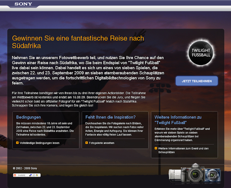 Sieben Fussballspiele im Abendlicht des 22. September 2009, atemberaubende Schauplätze auf vier Kontinenten, begeisterte Fotografen und Hobbyfilmer, die einen einzigartigen Event in der Abenddämmerung dokumentieren. Die europäische Digital Imaging-Kampagne «Twilight Fussball»soll eindrucksvoll die Stärken des neuen Exmor R CMOS Sensors demonstrieren. Nach den unlängst angekündigten Handycam Modellen HDR-CX505 und CX520 folgt nun der Kompaktkamera-Bereich: Als erste Cyber-shot Kameras sind die DSC-TX1 und WX1 mit der neuen Technologie ausgestattet und versprechen selbst bei schwierigen Lichtverhältnissen Aufnahmen in hervorragender Qualität.