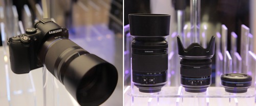 Im Gegensatz zu den erwähnten MicroFourThirds-Modellen ist die Samsung NX mit einem APS-C Sensor ausgestattet, was zur Folge hat, dass der koreanische Hersteller auch ein eigenes Objektivsortiment auf den Markt bringen wird. Auf der IFA wurden auch die entsprechenden Design-Muster mit verdeckten Lichtstärken gezeigt, doch entsprechen diese offensichtlich noch nicht den definitiven Ausführungen. Bei den gezeigten Objektiven handelt es sich um eine Festbrennweite mit 30 mm Brennweite, ein Normalzoom 18-55 mm und ein Telezoom 50-200 mm.