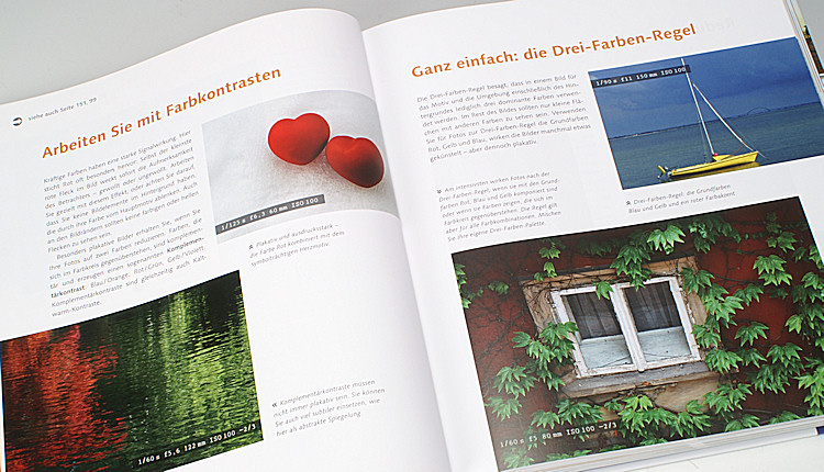 Wie sieht man fotografisch? / Gehen Sie näher heran / Achten Sie auf störende Elemente / Beziehen Sie Position / Achten Sie auf die Location / Harmonische Bilder gestalten / Benutzen Sie Ihre Fantasie / Schieflagen vermeiden / Exkurs: Mit Linien gestalten / Reine Formsache / Gleichartige Motive arrangieren / Entdecken Sie Strukturen / Fotografie abstrakt / Bunte Bilder? / Exkurs: Ein wenig Farbtheorie / Arbeiten Sie mit Farbkontrasten / Ganz einfach: die Drei-Farben-Regel / Reduzieren Sie die Farbe / Monochrome Bilder gestalten / Bilder selektiv entfärben / Farbe oder Schwarzweiss? / Für Schwarzweiss geeignete Motive / Cross-Effekte erzielen / Bildeffekte mit der Kamera / Farbe und Helligkeit als Blickfang / Zeigen Sie Grösse / Gesichter als Blickfang / Exkurs: Wählen Sie ein Bildformat / Setzen Sie Schärfe-Akzente / Exkurs: Mit Kontrasten arbeiten / Auflösung, Bildgrösse und Dateiformat