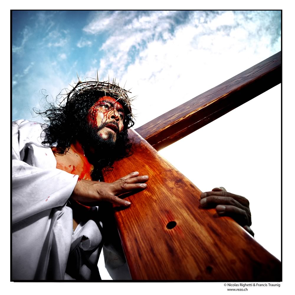 Unmittelbar nebenan finden wir die Reportage von Nicolas Righetti und Francis Traunig über die Kreuzigungs-Prozessionen in Mexiko. Der Kontrast könnte nicht grösser sein. Von den gelblichen Kodak-Farben taucht man in eine bunte, vitale Bilderwelt ein. Für die Ausstellung spielen die Fotografen mit kleinformatigen Abfolgen aus den Reportagen und grossformatigen Porträts einzelner Akteure. Righetti hat fünf Mal am Passionsumzug teilgenommen, und die Bilder vom Vorjahr als Geschenk an die Darsteller ermöglichten ihm stets einen tieferen Zugang zu den Menschen. Für die finale Reportage hat ihn Traunig unterstützt, ankedotisch bei der Kreuzigung mit einem Slave Flash, das im Katalog (Bildseite 12) noch sichtbar, auf dem Print ausradiert ist.