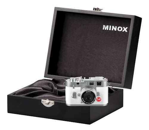 In der Minox Digital Classic Camera 5.0 White Edition steckt die Technik einer modernen Digitalkamera ausgestattet mit einer Auflösung von 5 Millionen Pixel. Die Überwindung der Gegensätze macht die Minox DCC zu einer faszinierenden Synthese aus Klassik und Moderne.  Für die neue Sonderedition wurde die DCC effektvoll in weiss gestylt und präsentiert sich in einer schwarzen, satingefütterten Holzbox mit Messingbeschlägen.