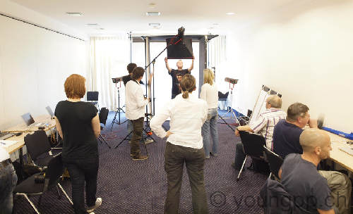 Der Aufbau eines mobilen Studios vor Ort will durchdacht sein. Nach dem Fotografieren konnte am eigenen Rechner die Bildoptimierung vorgenommen werden (Bild aus dem Workshop von Oliver Mark aus Berlin)