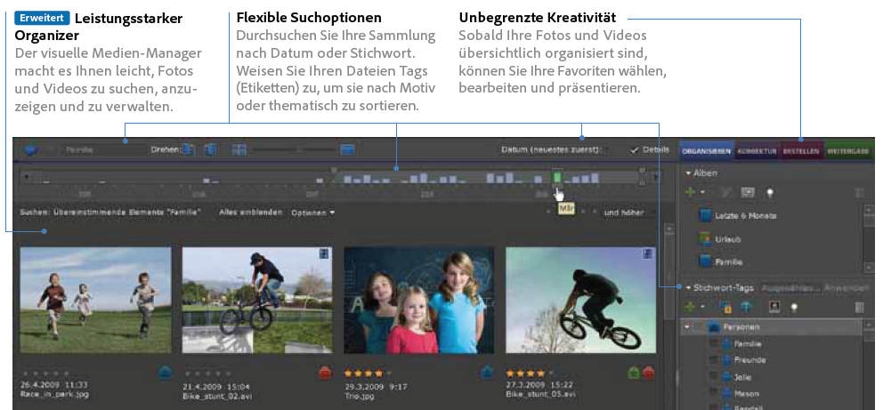 Mit der neuen Version führt Adobe einen leistungsstarken erweiterten Organizer ein, in dem Anwender jetzt bequem alle ihre digitalen Erinnerungen an einem zentralen Ort verwalten können. Zeitraubende Aufgaben wie das Zuweisen von Tags und hiermit verbundene Suchfunktionen wurden deutlich vereinfacht.