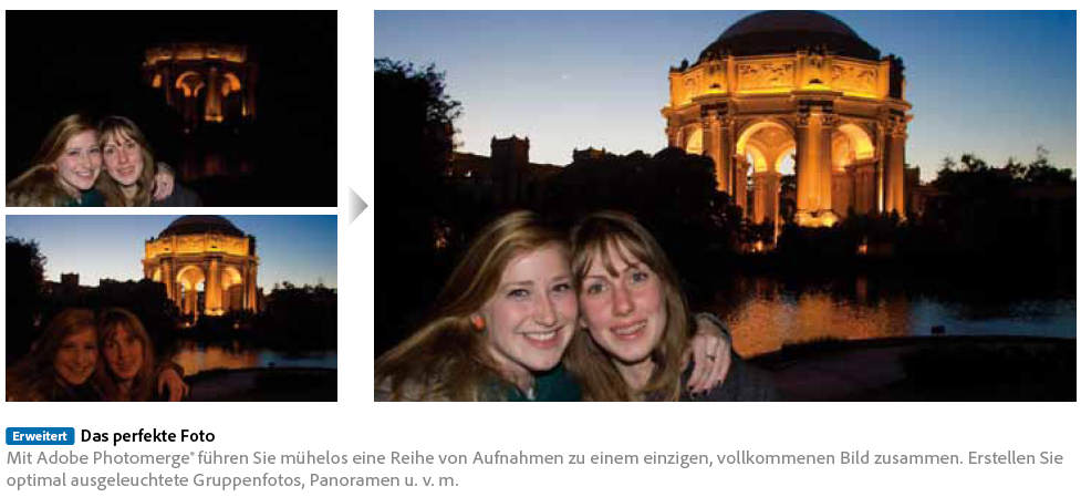 Adobe Photoshop Elements 8 bietet Nutzern Zugriff auf fortgeschrittene Technologien, die extrem einfach zu nutzen sind. Mit Adobe Photomerge-Belichtung lässt sich ein perfekt ausgeleuchtetes Bild erstellen, in dem jedes Detail einer Aufnahme zur Geltung kommt. Hierzu werden mehrere Bilder desselben Motivs – mit oder ohne Blitz aufgenommen – über wenige Klicks zu einem Bild zusammengefügt.