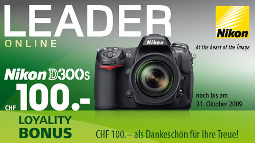 Wenn Sie jetzt Ihre Nikon Spiegelreflexkamera – egal ob analog oder digital – gegen eine Nikon D300S eintauschen, belohnt Nikon Ihre Markentreue mit CHF 100.–. Das Angebot gilt nur bis zum 31. Oktober 2009. Deshalb: Nicht zuwarten, sondern jetzt zugreifen.