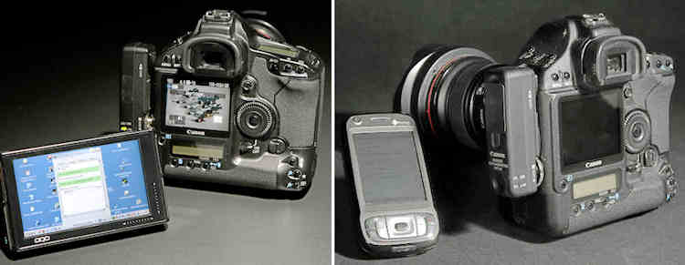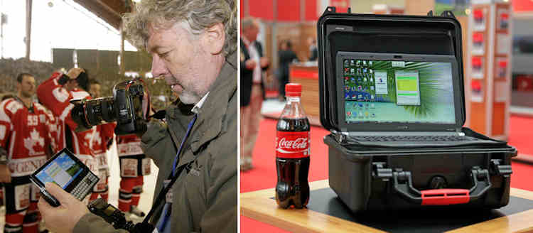 Mit einem ultramobilen Computer (UMPC, links) oder einem Mobile Phone mit integriertem WLAN und 3G können die hochaufgelösten Bilder der Canon EOS-1Ds Mk-III dank der Software «Idrune Remote Editing System» (IRES) entweder aktiv per FTP zur Redaktion übermittelt oder aber vom Bildredaktor passiv via Internet betrachtet und innerhalb von Sekunden heruntergeladen werden.