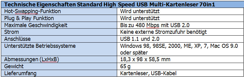 Der Kartenleser liest bis zu 70 verschiedene Speicherkartenformate, darunter alle gängigen Compact Flash (CF), Secure Digital (SD) und Smart Media Karten sowie alle gängigen Memory Sticks (MS). Der 70in1 Kartenleser wird einfach über das mitgelieferte USB-Kabel an einen PC / Mac angeschlossen und unterstützt Hot-Swapping.