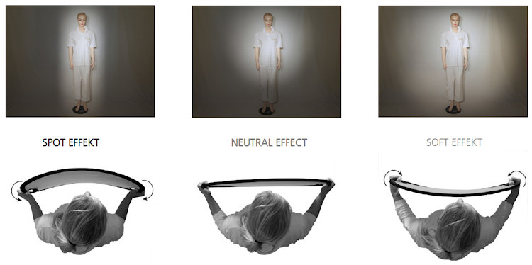 Der «Sun-Mover» kann in der Spot-Funktion die Lichtmenge erhöhen oder das Licht über Distanzen ohne grosse Lichtverluste transportieren. Die ovale statt der runden Form sorgt zusammen mit den beiden seitlich stabilen Handgriffen für eine permanent straffe und plane Spannung, die kontrolliertes Biegen ohne Faltenbildung möglich macht. Biegt man den Sun-Move nach innen (die Mitte des Reflektors zeigt zum Körper) wird er konkav und bündelt das Licht wie ein Spotlicht zu einem sehr harten und intensiven Licht ohne viel Streuung. Möchte man die Sonne nur umlenken, weil sie an der falschen Stelle steht, kommt der Sun-Mover in neutraler Position zum Einsatz. Biegt man den Sun-Mover nach aussen, formt ihn also konvex, vergrössert sich die ausgeleuchtete Fläche und sehr viel weicheres Licht entsteht.