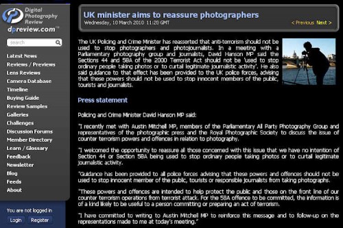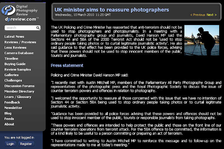 Wie www.dpreview.com kürzlich berichtete, hat der «UK Policing and Crime Minister» bekräftigt, dass das Gesetz gegen den Terrorismus (Sections 44 and 58A of the 2000 Terrorist Act) nicht dazu diene, gewöhnliche Bürger oder Touristen am Fotografieren zu hindern und Pressefotografen sowie Journalisten bei ihrer Arbeit einzuschränken. Entsprechende Richtlinien seien an alle Polizeistellen des Landes geleitet worden.