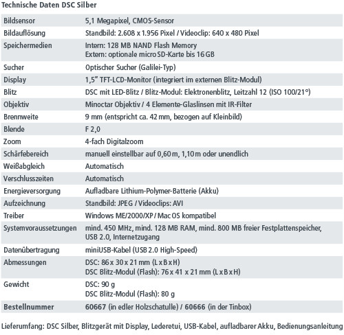 Zum Lieferumfang der Minox DSC gehören neben dem externen Blitzgerät mit dem Display ein Lederetui und eine Metallkette für den Transport, ein USB-Kabel und ein Handbuch mit Bedienungsanleitung. Die Minox DSC kostet in der Holzbox CHF 415.00 und in der Metallbox CHF 365.00