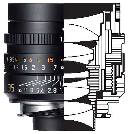Das Leica-Summilux-M 1:1,4/35 mm Asph. besteht aus neun Linsen, darunter fünf aus hoch brechenden Glassorten. Eine Linse trägt eine asphärische, von der Kugelform abweichende Linsenfläche, die einen wichtigen Beitrag zu der sehr kompakten Bauform des Objektivs liefert. Zusammen mit dem geringen Gewicht von 320 Gramm eignet es sich hervorragend für das leichte Fotogepäck auf Reisen oder die Reportage.