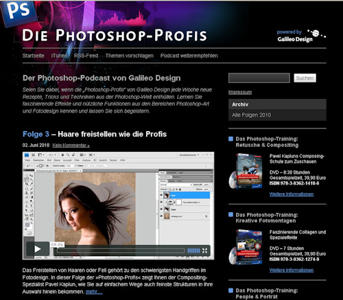 Der Verlag Galileo-Design bietet nicht nur ein breites Buchsortiment über digitale Fotografie und Bildbearbeitung, sondern er engagiert sich auch im Bereich der elektronischen Medien. Neu kann man Tipps zu Photoshop auf dem PC anschauen oder als Podcast herunterladen.