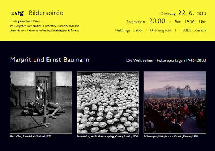 Heute Abend um 20:00 Uhr (Baröffnung 19:30) findet in Heptings Labor Zürich die vfg Bildersoirée mit Margrit und Ernst Baumann statt, das Reporter-Ehepaar, das auf die spannenden Jahre 1945 bis 2000 zurückblickt und auf den gemeinsamen Reisen viel erlebt hat. Zur Zeit gibt es dazu im Kornhausforum Bern eine Ausstellung, und es ist ein Bildband im Verlag Scheidegger & Spiess erschienen.