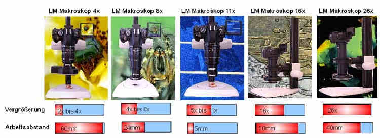 Die beiden LM DSLR Makroobjektive 16x und 26x besitzen eine 16x bzw. 26x Mikroskopvergrösserung (Vergrösserungsäquivalent eines Mikroskops, zusammengesetzt aus Okular und Objektiv).Es gibt ähnlich wie bei einem Mikroskop keine Automatikfunktionen. Zur Erhöhung der Schärfentiefe kann die Blende zwischen 2,8 und 16 manuell eingestellt werden.