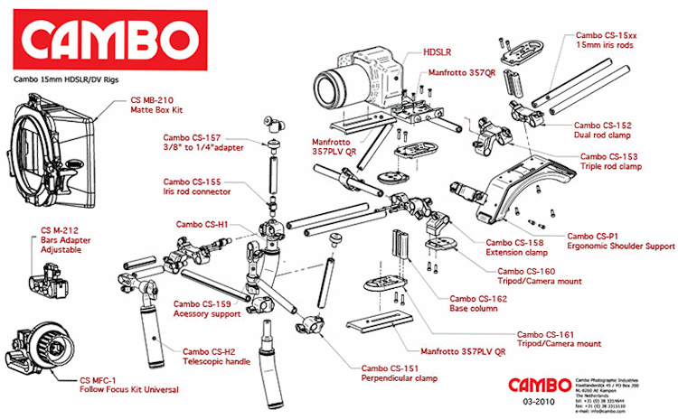 Die niederländische Firma Cambo ist besonders für ihre Fach- und Architekturkameras sowie als Hersteller von Fotostudio-Euipment (Säulenstative, Aufnahmetische etc.) bekannt. Cambo stellt aber auch professionelles Film-Equipment (Dollys, Kräne etc.) her und hat nun ihr Sortiment um Rigs für Video-DSLRs und Camcorder erweitert. Diese Produktlinie trägt den Namen „HDSLR CS Rig System“ (CS = camera support).