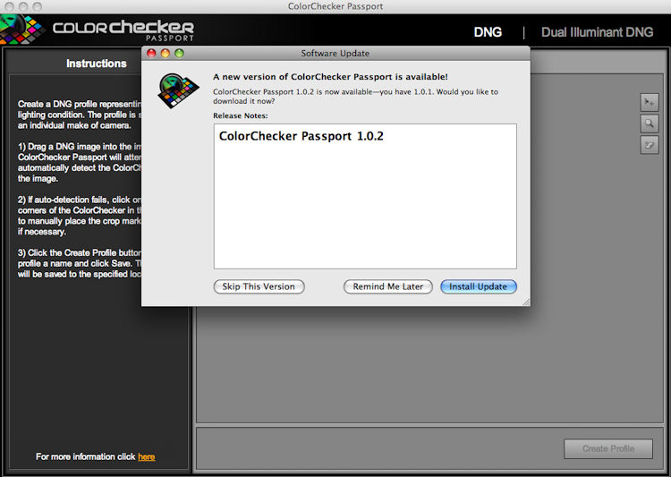 Die Installation der neuen Version des ColorChecker Passport ist denkbar unkompliziert. Beim Start der ColorChecker Passport-Software (nicht des Lightroom-Plugins) wird ein Dialogfeld angezeigt, das den Anwender auf die neue Version 1.0.2 hinweist und zur Bestätigung des Downloads auffordert. Dasselbe Dialogfeld lässt sich auch mit den Befehlen «Hilfe»  und «Auf Updates prüfen» im ColorChecker Passport-Hauptmenü aufrufen. Nach der Installation des Updates muss nur noch Lightroom (bei Verwendung des Plugins) oder die ColorChecker Passport-Software neu gestartet werden – und schon kann es losgehen!