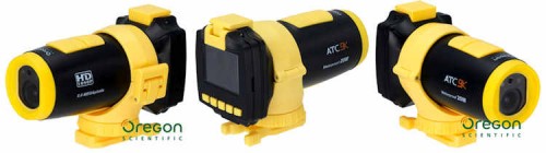 «Oregon Scientific ATC9K» heisst eine neue Vertreterin dieser Gattung, die von der «Integrated Display Technology Ltd.» in Hong Kong hergestellt wird. Ihr gelb-schwarzes, auffälliges Kunststoffgehäuse soll bis 20 Meter wasserdicht sein. Charakteristisch ist die Stativschelle, welche das Objektiv umfasst und die Drehung der Kamera für Hoch- und Querformataufnahmen ermöglicht. Auf dem Objektiv sind zwei grosse Auslösetasten angeordnet, eine für Foto- und eine zweite für Videoaufnahmen. Die Kamera zeigt auf der Rückseite fünf auffallend grosse Einstelltasten, welche auch mit Handschuhen gut bedient werden können.