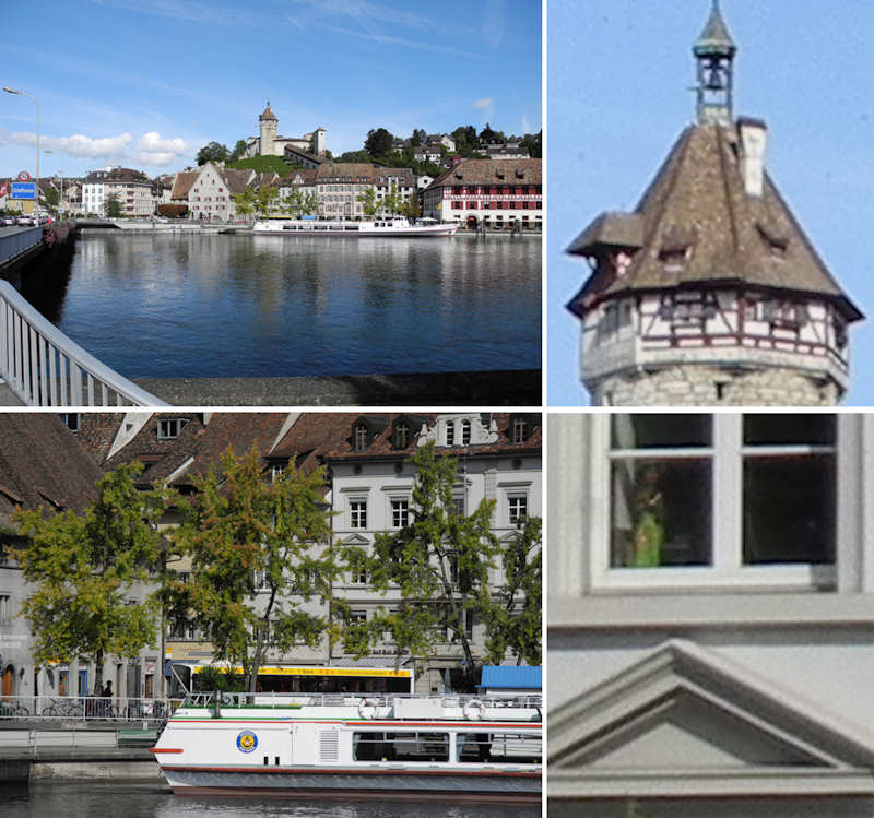 Nikon Coolpix P7000: Oben Weitwinkelposition und 300%-Ausschnitt, unten Tele-Einstellung mit 300%-Ausschnitt
