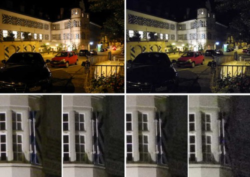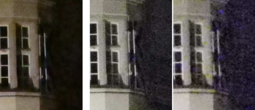 Nikon Coolpix P7000: Nachtaufnahme mit (unten) 200%-Ausschnitten ISO 400, 800, 1600 und 3200