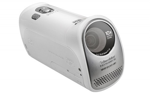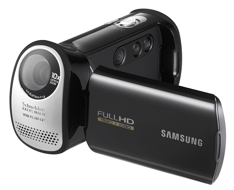 Der Full-HD-Camcorder HMX-T10 von Samsung erlaubt eine komfortable Kamerahaltung dank seinem futuristischen Design. Mit dem leicht nach oben guckenden 10-fach-Zoom lässt sich der Camcorder beim Filmen entspannt nach unten geneigt halten, während er dennoch geradeaus filmt.