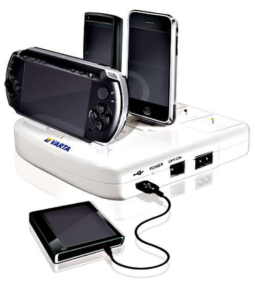Die Varta V-Man Home Station ist ein Multi-Ladegerät für verschiedenste Mobilgeräte. Egal ob Handy, Digitalkamera, MP3-Player oder PSP – das Multitalent lädt bis zu vier Gadgets gleichzeitig auf. Sogar Mignon- (AA) und Micro- (AAA) Akkus lassen sich mit der V-Man Home Station wieder aufladen.