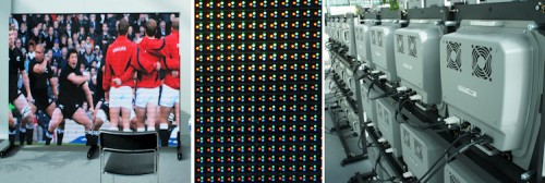 Für Innen und Aussenanwendungen bietet NEC verschiedene LED-Monitore. Die Grundeinheiten von 50 x 50 cm werden zu riesigen Bildwänden aneinander montiert