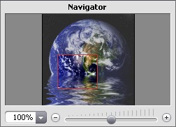 Im Navigator-Fenster kann man das Bild skalieren. Ein roter Rahmen zeigt den Bereich des Bildes, der im Bildfenster angezeigt wird. Wenn Sie den roten Rahmen über das Bild verschieben, ändert sich der sichtbare Bereich im Bildfenster. Um den roten Rahmen zu verschieben, bringen Sie den Cursor in den Rahmen hinein, drücken die linke Maus-Taste und sie gedrückt haltend, ziehen Sie den Rahmen.