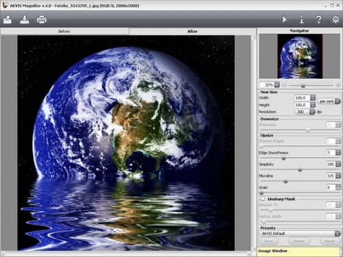 Der «Akvis Magnifier» ermöglicht es, Fotos zu vergrössern, ohne dass das Bild an Schärfe verliert. Wenn Sie versuchen, Bildauflösung mit dem Standardbefehl eines Bildbearbeitungsprogramm zu erhöhen, werden Sie feststellen, dass das Ergebnis unscharf und pixelig wird. Der Grund dafür ist, dass das Originalfoto nicht genügend Information für die neue Grösse enthaltet. Der «Akvis Magnifier» löst dieses Problem. Dank dem effizienten Algorithmus kann das Programm digitale Bilder zur sehr hohen Auflösung für die Produktion von Postern vergrössern.