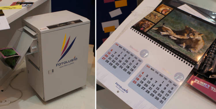 Ein unübersehbarer Trend sind natürlich Fotobücher, die das dramatisch rückläufige Printgeschäft wenigstens einigermassen kompensieren. Gigangtisch ist der Stand von Cewe, unübersehbar gewisse andere Marken mit Verarbeitungsmachinen, wie Noritsu, KIS Photo-me, Mitsubishi und Fotolusio. Bei letzterem muss man schon genau hinsehen, wenn man den Prototyp des doppelseitigen Printers zur Herstellung von Fotobüchern entdecken will. Etwas versteckt steht er unter der Theke, und es braucht einiges an Überredungskunst, damit man das Gerät für ein Foto hervorzieht. Es sei noch nicht ganz so weit und drucke noch nicht so recht, aber die Vorzeigemuster sind schon recht vielversprechend. Vorallen sind die zwei Druckköpfe des Gerätes spannend, von dem einer die Farbtinte aufträgt und ein zweiter einen Metalllayer, welcher einen Hologramm-Eindruck auf das Bild zaubert. Das gibt bei Fotoalben, Glückwunschkarten und Kalender ganz neue grafische Gestaltungsmöglichkeiten.