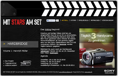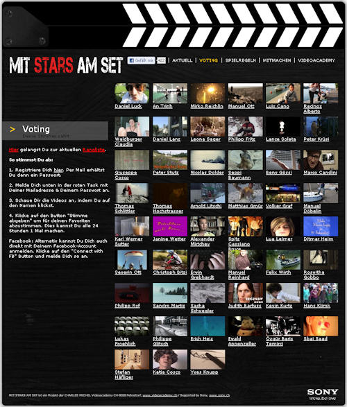 Der Videowettbewerb «Mit Stars am Set» läuft auf vollen Touren. Bereits sind über 50 originelle und lustige Videos eingegangen, die Sie jetzt bewerten können. Ihre Stimme zählt, und vielleicht gewinnen Sie eine Sony Videokamera HDR CX115E Anniversary Edition, von denen jeden Tag drei Stück verlost werden.
