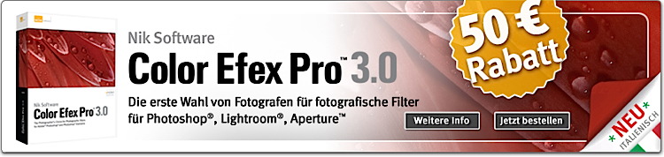 Der Hersteller Nik Software bietet derzeit auf seiner web site beim Kauf von Color Efex Pro 3.0 einen Rabatt von 50 Euro.
