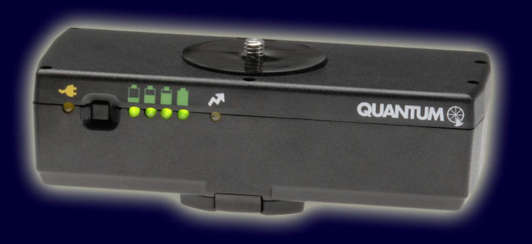 Die Befestigungsschraube verfügt unten über eine Stativgewindebuchse, so dass die Kamera auch mit angesetztem Akku auf einem Stativ benutzt werden kann. Das Systemblitzgerät der meisten Marken wird über ein Turbokabel mit der nötigen Energie versorgt. Quantum gibt an, dass mit einer Akkuladung 400 Vollblitze gezündet werden können. Berücksichtigt man die Tatsache, dass in den meisten Fällen Blitze nur mit Teilenergie gezündet werden, so wird offensichtlich, dass die Akkuladung weitaus länger hält und für Tausende von Blitzen ausreicht.