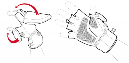 Für solche Fälle gibt es von Kaiser Foto-Funktions-Handschuhe, die sowohl Fäustling- als auch Halbfingerhandschuh sind und damit einerseits gut wärmen, andererseits aber auch die Bedienung der Kamera zulassen. Dazu werden die Finger- und Daumenabdeckungen einfach weggeklappt und mit einem Klettverschluss am Handrücken fixiert. Der vordere Teil der Finger und des Daumens sind jetzt frei.