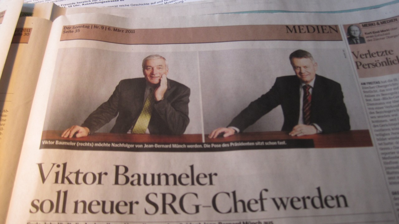 Dass Bilder mehr sagen können als Texte, zeigt Der Sonntag auf Seite 35 mit dem Beitrag von Kurt-Emil Merki. Der amtierende Präsident des grössten Medienunternehmens unseres Landes, Jean-Bernard Münch wird seinem vermutlich unausweichlichen Nachfolger Viktor Baumeler gegenüber gestellt. Die Aufnahmen kommen aus dem Archiv von SRF. Ob der frühere Luzerner Staatsschreiber wirklich die Leuchtfigur ist, die das einzige öffentlich-rechtliche Medienunternehmen in eine strahlende Zukunft führen kann, bleibt offen. Zumindest hat er ein lupenreines Parteibuch.