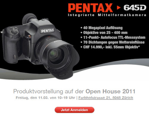 Sinar Photography AG/Tekno hat mit Pentax eine Vereinbarung für den exklusiven und sofortigenVertrieb der Pentax 645D im professionellen Markt in der Schweiz unterzeichnet. In der Folge wird Sinar Photography AG/Tekno die derzeit noch rare Pentax 645D zeigen und über den geplanten Systemausbau informieren. Zum Besuch der Veranstaltung am Freitag, 11. März, 10 bis 19 Uhr ist Voranmeldung erforderlich: