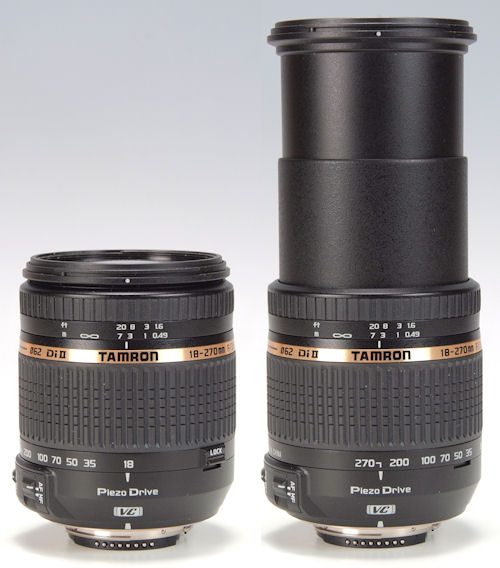 Das Objektiv bei 18 mm (links) und 270 mm Zoomstellung (rechts)
