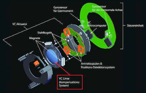 Der VC Mechanismus besteht aus einer beweglichen Linse, dem VC Element, das die Vibrationen durch Bewegungen parallel zur Bildebene ausgleicht. Kontrollorgane sind ein Positionsdetektor und eine Steuereinheit, in welcher zwei Gyro-Sensoren die horizontalen und vertikalen Vibrationen erfassen und an den Mikroprozessor melden. Dieser berechnet den Rotationswinkel und gibt entsprechende Steuerbefehle an die Antriebseinheit, die das VC Element mit drei Magneten entgegen der Vibrationsrichtung verschiebt. Dieser Vorgang wiederholt sich 4000-mal pro Sekunde.