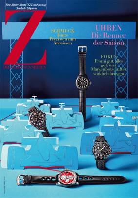 Das ZEIT MAGAZIN pflegt teilweise auch in der Drucktechnik die Schwarzweiss-Fotografie. Sie ist mehr als ein Stilelement. Man bevorzugt ein matteres Papier, das Heft wirkt weniger speckig. In der Mitte findet sich eine hervorragende Aufnahme von Paolo Pellegrin mit einem Mädchen am Rande eines Atommülllagers in Kasachstan. Selbst Life Style und Product Placement werden stilvoll präsentiert. Raphael Just fotografierte Uhren mit dem Design der sechziger Jahre. Auf Seite 43 legt sich auch das ZEIT MAGAZIN quer, mit Pierre Brice (Aufnahme Primoz Korosec).