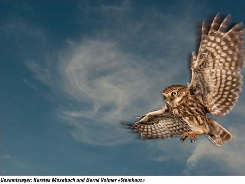Karsten Mosebach und Bernd Volmer zu ihrem Siegerbild: «Schon seit vielen Jahren arbeiten wir regelmäßig an gemeinsamen Foto-Projekten. Im letzten Jahr haben wir uns von Anfang Mai bis Ende Juli mit einem Steinkauzpaar auf einer Streuobstwiese am Rande des Teutoburger Waldes beschäftigt. Sobald die Altvögel eine von uns aufgestellte Sitzwarte regelmässig aufsuchten, begannen wir damit, die Tiere erst auf ihrer Sitzwarte und anschliessend im Abflug von der Sitzwarte zu fotografieren. Dabei belichteten wir manuell mit 1/250 Sekunde bei Blendenwerten zwischen 11 und 16. Ein auf der Kamera befindlicher Masterblitz löste die anderen Blitzgeräte kabellos über Fotozellen aus. In diesem Bild wurde der Vogel von zwei seitlich rechts und links sitzenden Blitzen beleuchtet. Aus einem Tarnversteck heraus lösten wir die Kamera über eine Kabelfernbedienung aus. Im Gegensatz zur Verwendung einer Lichtschranke, wobei pro Abflug jeweils nur eine Auslösung möglich ist, erlaubte uns dieses Vorgehen das Aufnehmen von Serien. Konnten wir zu Beginn lediglich Aufnahmen vor einem schwarzen Nachthimmel im Hintergrund machen, gelangen später auch einige Aufnahmen mit blauem Himmel, denn die Tiere verlagerten gegen Ende der Aufzuchtphase ihren Aktivitätsgeginn deutlich in die Zeit vor Sonnenuntergang. Die unscharfen Doppelkonturen resultieren direkt aus der grossen Restlichtmenge am Himmel in Verbindung mit den schnellen Flügelschlägen, die durch die Belichtungszeit der Kamera – nicht durch die Leuchtdauer der Blitzgeräte – anders als vor einem schwarzen Hintergrund nicht ‚eingefroren‘ werden.»