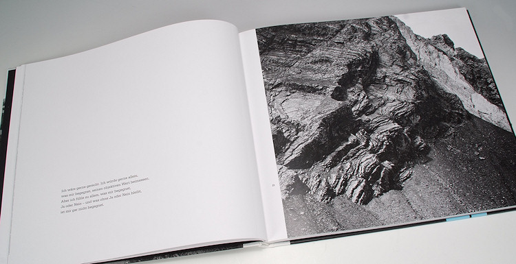Der Bildband ist vorbildlich gestaltet mit dem nötigen Freiraum, welchen die Bilder auf den Doppelseiten brauchen, um die gewollte Wirkung zu erzielen. Auf den weissen Flächen stehen Kurztexte von Fridolin Brühlmann, die kaum einen direkten Bezug zu den Bildern haben, die jedoch zum Nachdenken anregen und uns plötzlich in eine ganz andere philosophische Welt entführen. Es sind diese Texte, ebenso wie die Einleitung von Nadine Olonetzky und der geografische Exkurs von Rahel Marti, die den Bildband lesenswert ergänzen.