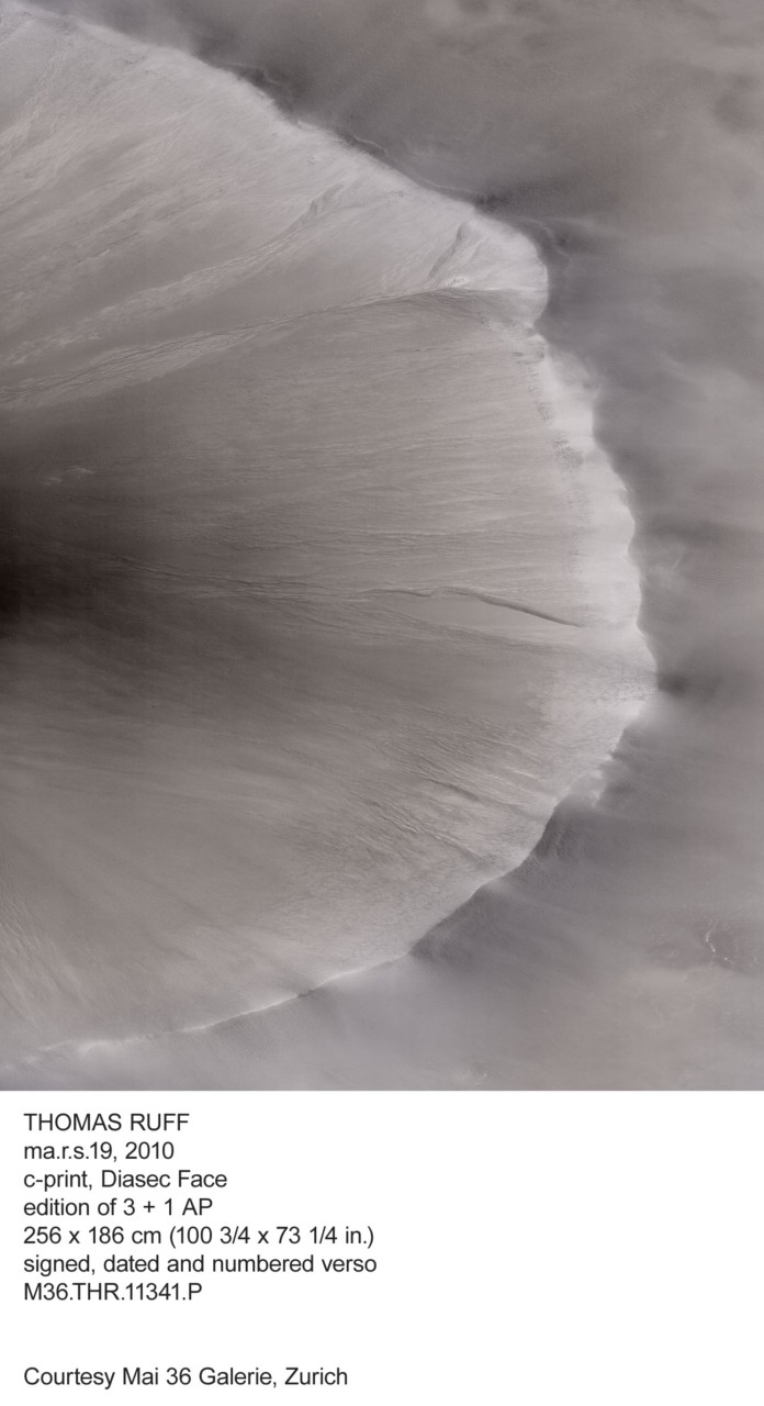 Die MAI 36 GALERIE an der Rämistrasse in Zürich präsentiert von Thomas Ruff den Werkkomplex ma.r.s. An wissenschaftlichen Bildern interessiert, stiess Ruff auf Bilder, die eine Raumsonde der NASA 2005 in hoher Auflösung zur Erde sandte. Er begann damit zu arbeiten und ein Portfolio zu entwickeln. Für die Kunstkritikerin Valeria Liebermann, die zur Ausstellung in Zürich einen Text verfasst hat, wirken die Aufnahmen wie die „Vorwegnahme von zukünftigen Reisebildern“.
