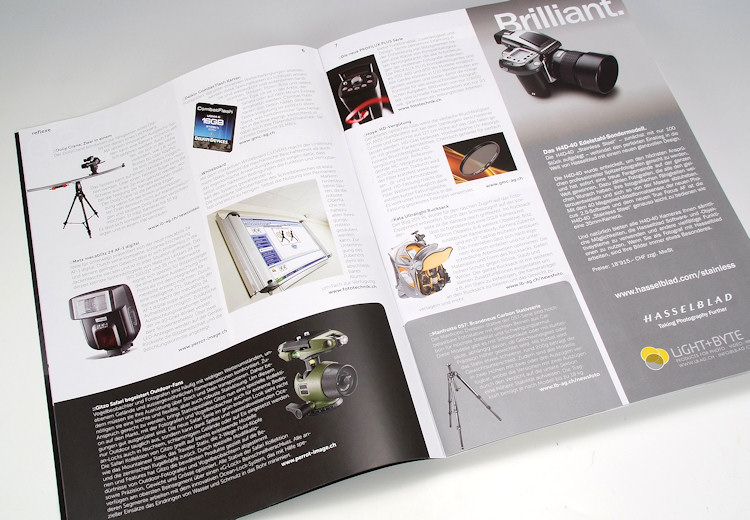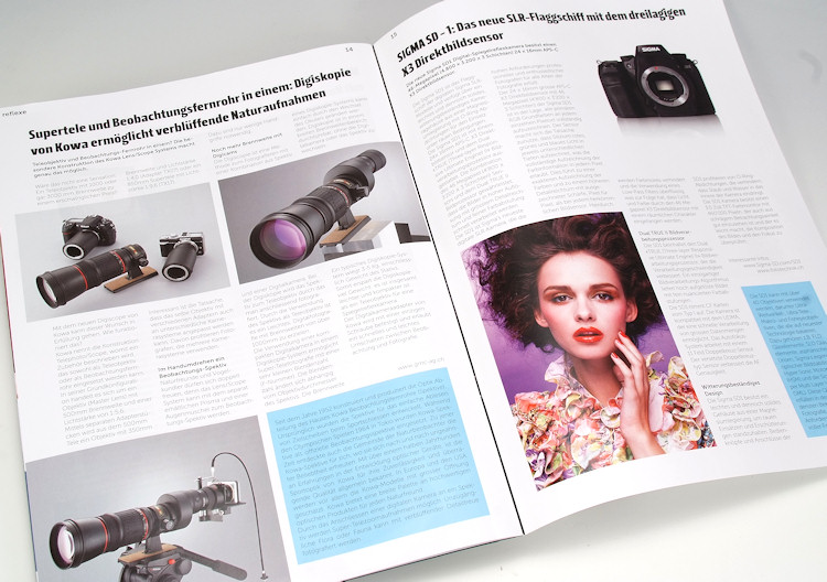 Nach dem Portfolio wechselt das Grundlayout des Magazins von Schwarz zu Weiss: Andere Titelschrift, drei- und vierspaltiger Umbruch. Hier werden vier aktuelle Produkte als Erfahrungsberichte umfangreicher präsentiert: Das Tamron 1:3,5-6,3/18-270 mm als leichtestes Reisezoom, der Packshot-Creator als «vollautomatisches Fotostudio», das Digiscope von Kowa als beeindruckendes Supertele und Beobachtungsfernrohr und letztlich die SD-1 als DSLR-Flaggschiff aus dem Hause Sigma.